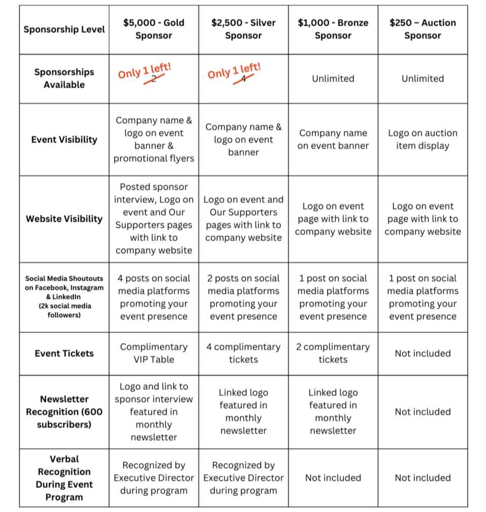 As a Silver Sponsor, you’ll help drive our mission while gaining meaningful visibility. With limited availability, your company will enjoy spotlight recognition throughout our event and online promotions.